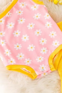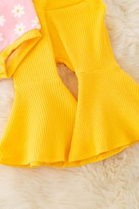 Brighten her day with this playful two-piece set! The pink ribbed onesie features a cheerful white daisy print with sunny yellow trim, perfectly paired with bold yellow bell-bottom pants for extra flair. Soft, stretchy, and full of charm this outfit is made for twirls, smiles, and sunny adventures.