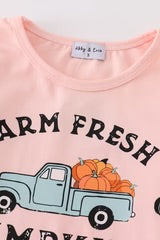 Bring on the autumn charm with this Pink Farm Fresh Pumpkins Top! Featuring soft, breathable fabric and a sweet pastel pumpkin truck graphic, it’s perfect for layering or wearing solo. Ruffle sleeves add a playful touch, making it a go-to for all her fall adventures.