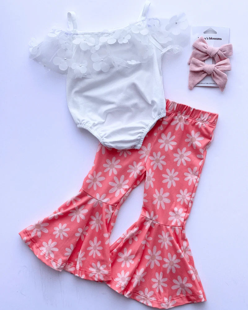 Fun, floral, and full of flair! These coral bell bottoms feature a bold print and exaggerated flares for the perfect retro-inspired look. Soft, stretchy, and comfy for all-day play.