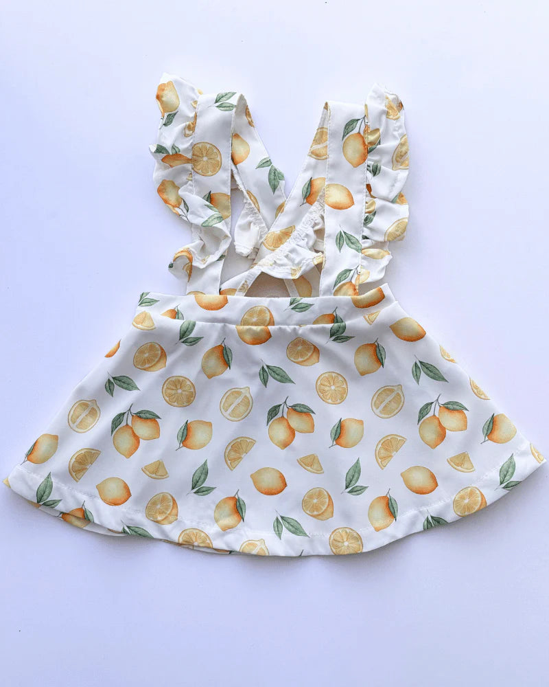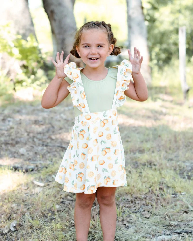 Sweet, stylish, and perfect for sunny days! This darling outfit pairs the vibrant Addy Ruffle Suspender Skirt in Lovely Lemons with the timeless Maggie Cap Sleeve Leotard in Sage Green for a look that’s full of charm and comfort. The soft, earthy green leotard balances beautifully with the bright lemon print, while ruffle suspenders and cap sleeves add the perfect feminine touch.