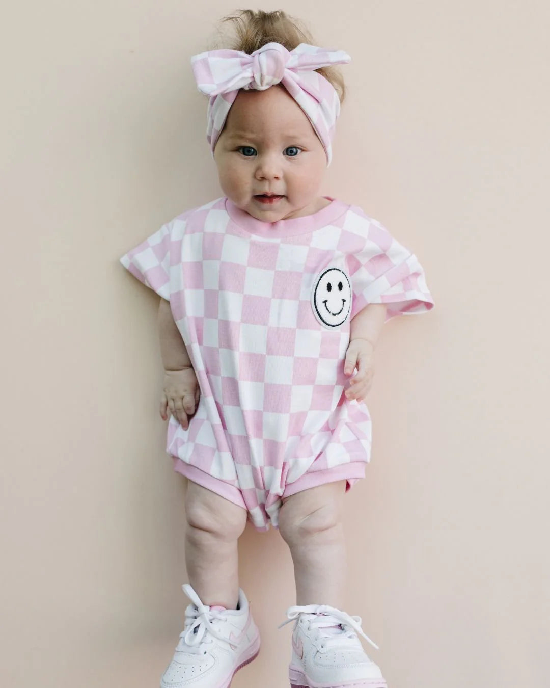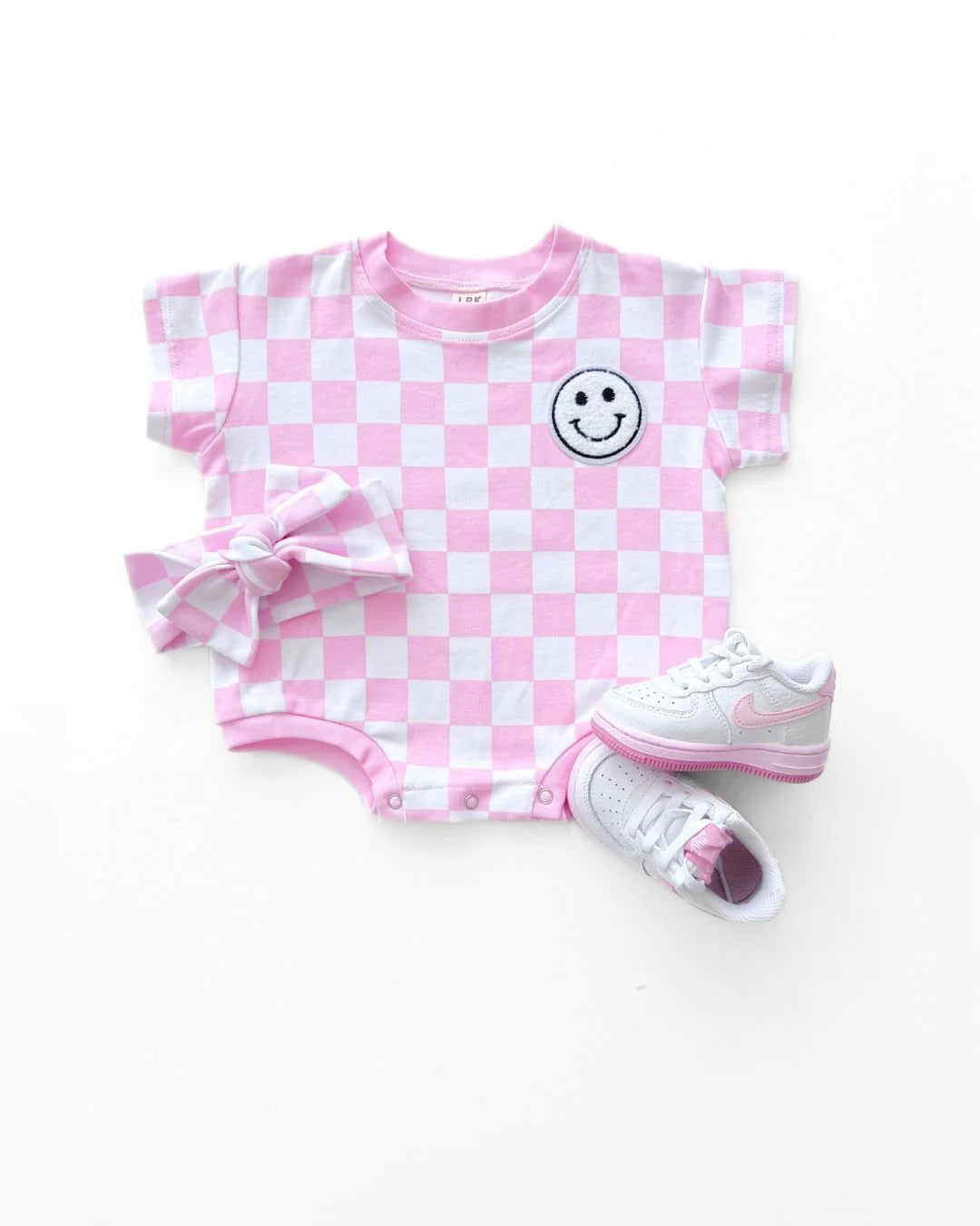 Shirt Sleeve Bubble Romper-Checkered Smiley Pink