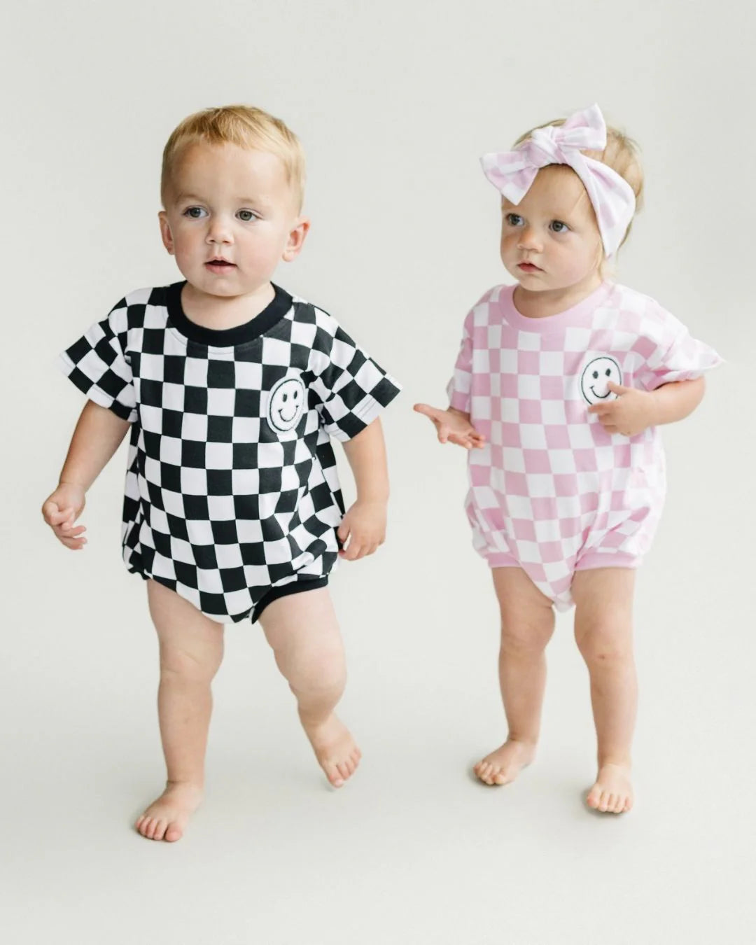 All the happy vibes in one playful romper! This short sleeve bubble romper features an eye-catching pink and white checkered print. Made from soft, breathable cotton with a comfy bubble fit, it’s perfect for playdates, photo ops, or just spreading smiles all day long. Bring on the smiles this romper is pure joy!